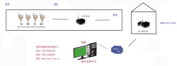 儀表本身配置的無(wú)線(xiàn)信號(hào)模塊,采用的數(shù)據(jù)無(wú)線(xiàn)傳輸距離可達(dá)3-4公里,但是隨著隧道的工況和彎道不同,可能需要配置信號(hào)中繼器。視具體隧道的長(zhǎng)度,來(lái)配置1-2個(gè)信號(hào)中繼器,信號(hào)中繼器也采用畜電池供電。